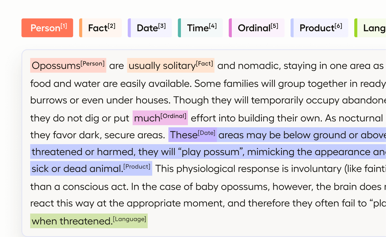 If you want to perform named entity recognition (NER) on a sample of text, use this template. This template supports overlapping text spans and very large documents.